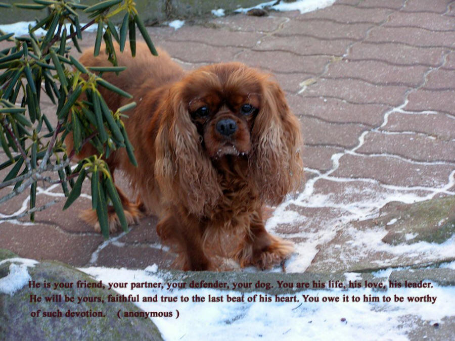 mit meinen Hunden. MÄRZ 2021 Hier ist die dritte Geschichte. Es war Winter. Ende Februar 2005. In den Gärten lag noch Schnee und auf den Straßen war Schneematsch. Es regnete, taute und taute vor sich hin. Die Hunde hatte ich für eine Weile im Garten. Sie sollten sich lösen und bei dem Wetter schnell wieder ins Haus kommen. Regenwetter mögen sie nicht wirklich. Da schrillte das Telefon und eine Nachbarin meldete mir: " Heidi, dein komplettes Rudel ist auf der Straße Richtung Helpterberg unterwegs." OMG!! Das durfte doch nicht wahr sein! Ich rannte total erschrocken aus dem Haus. Ohne Jacke, in meinen guten Haflinger Filzpantoffeln. Musste sie irgendwie wieder einfangen. Knappe 100 m von meinem Grundstück entfernt auf der rechten Straßenseite liegt ein Gehöft. Ein großes Haus, ein ganz großer Garten mit sehr viel Rasen drum herum. Und dieses Grundstück bewachte damals eine Kaukasische Schäferhündin. Ging wer an diesem Grundstück vorbei, war sie in Blitzesschnelle am Zaun und bellte kräftig, so dass man gewaltig erschrak, war man darauf nicht vorbereitet. Bei Spaziergängen mit unseren Hunden wollten die immer sehr schnell vorbei an diesem Gehöft und blickten dabei eher ängstlich zur Seite. An der Straßenkreuzung wollte ich mich zunächst überzeugen, wie weit sie schon gekommen waren. Was ich aber in meiner Verzweiflung sah, war erstmal gar nichts, nichts vom Rudel. Das konnte doch alles nicht wahr sein. Ich fühlte mich wie in einem falschen Film. Wie schnell waren sie auf der Straße entlang getobt? Wo um alles in der Welt waren sie abgeblieben?? Und dann entdeckte ich sie, das gesamte Rudel. Sie waren alle in dem Gehöft, das die Kaukasin bewachte. Sie hüpften fröhlich um Alma, so hieß die Kaukasische, herum. Die war auch guter Dinge, rollte sich ausgelassen durch den Schnee. Freute sich, wedelte und leckte das eine und andere Cavaliermädchen mit ihrer großen Zunge ab. Meine Güte, wie sollte ich da 10 Cavaliere aus dem Gehöft holen!! Alles war dort abgeschlossen. Die Cavaliere waren durch den großen Metallzaun gekrochen. Die Kaukasin kam da nicht durch, aber die Cavaliere fanden ein Schlupfloch, voran Ustja, die kluge Ruby und Chefin. Was tun? Ich nahm meinen ganzen Verstand zusammen, blieb auf der Kreuzung stehen und pfiff mit vier Fingern im Mund. Sehr laut. Der Pfiff war weithin zu hören. Ustja, die Chefin, reckte sofort Kopf und Hals. Sie sah mich, sagte dem Rudel etwas wie: " Kehrtwende! Mir nach! " Und sie kroch mit dem Rudel aus dem Zaun, einer nach dem anderen. Und sie führte sie zurück in unser Gehöft. Alle im Gänsemarsch, alle im Eiltempo hinter ihr her. Nein, ich hab mit ihnen nicht geschimpft. Im Gegenteil. Ich lobte Ustja dafür, dass sie sofort auf meinen Pfiff reagiert hatte und alle wohlbehalten nach Hause brachte. Alma, die Kaukasische, dachte mit Sicherheit: " Schade, dass sie schon wieder fort sind." Alma wurde sehr alt. Sie lebt längst nicht mehr. Unsere Cavaliere von damals natürlich auch nicht mehr. Die Besitzer verkauften das Grundstück und bauten uns gegenüber ein neues kleineres Haus. Aber auch da gibt es einen sehr großen Garten. Und wieder wacht da eine Kaukasin, Almas Tochter. Sie ist ganz lieb. Und alle Cavaliere, einschließlich Mali Alice, sagen ihr über die Straße gern mal : " Wau, Waff, Hallo ! " Gemeinsam bellen sie, wenn sich nach ihrer Meinung etwas Unnormales auf der Straße vollzieht. So soll es sein. |